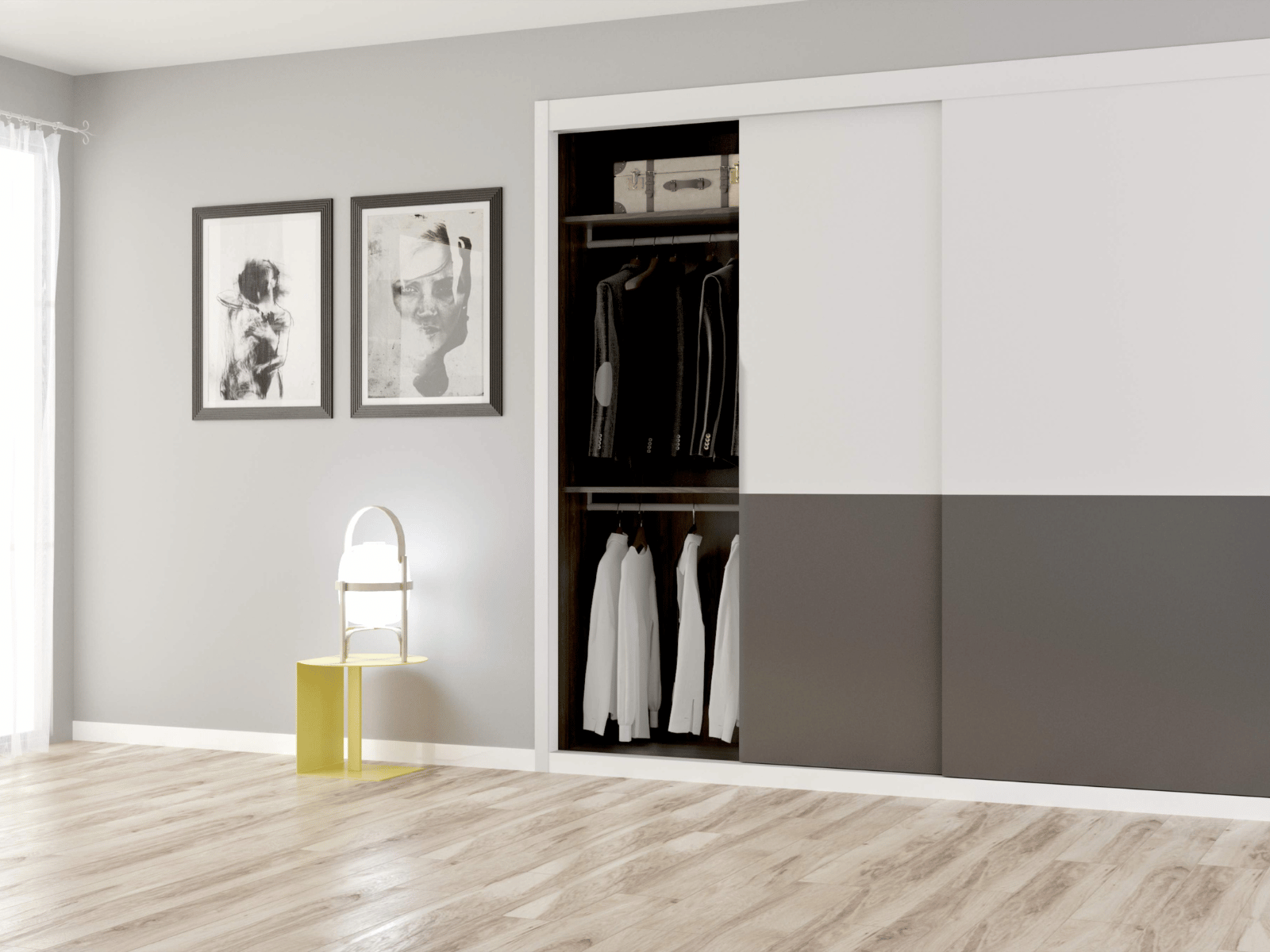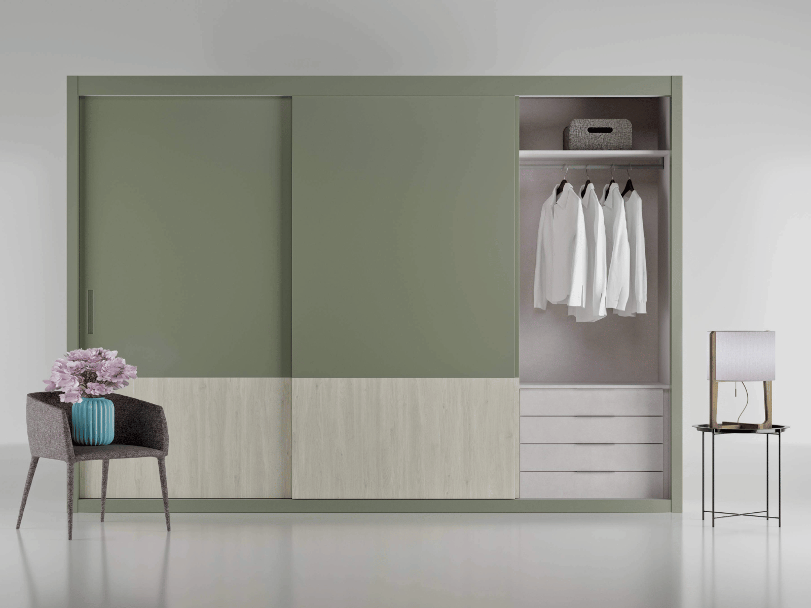 Los armarios de puertas correderas o deslizantes son la mejor opción para las situaciones en las que la apertura hacia fuera molesta o no es posible. Cuentan con la ventaja de que su apertura deja una gran parte del interior a la vista, lo que siempre es de agradecer. Nuestros armarios pueden montar además sistemas de frenado amortiguado para las puertas que ayuden a un suave cerrado y ajuste.